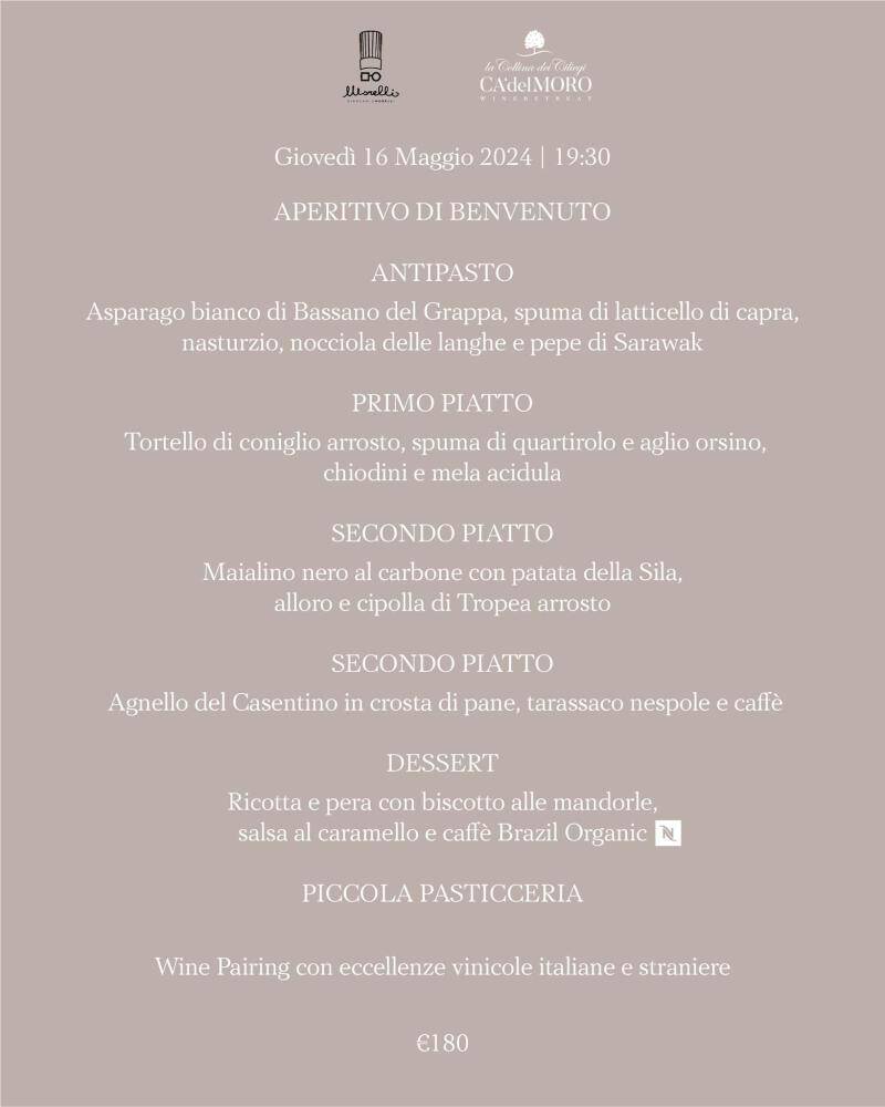 Ca’ del Moro Wine Retreat ospita l'aperitivo con vista sulla Valpantena e a seguire la cena di sei portate ad opera di Giancarlo Morelli Chef di Ristorante Morelli e di Giuseppe Lamanna Chef di Ca’ del Moro Wine Retreat con Wine Pairing con eccellenze vinicole italiane e straniere.